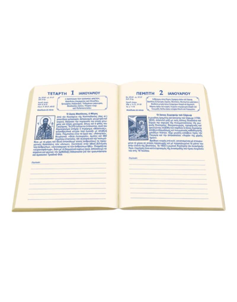 Περιέχει πλήρες εορτολόγιο, βίους και εικόνες Aγίων για κάθε ημέρα, νηστείες και αγιογραφικά αναγνώσματα.