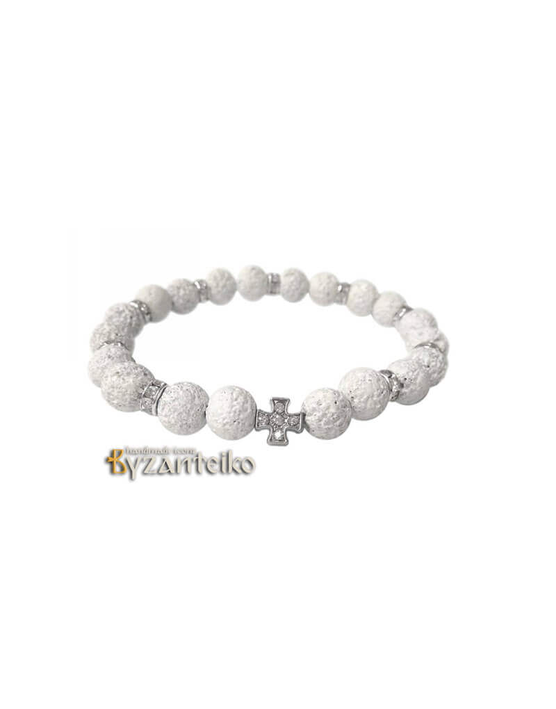 Βραχιόλι με λευκές πέτρες Λάβα και μοτίφ σταυρό.
