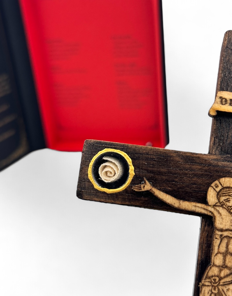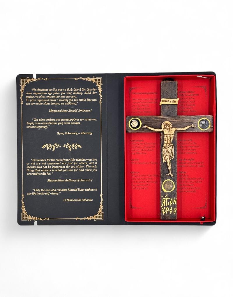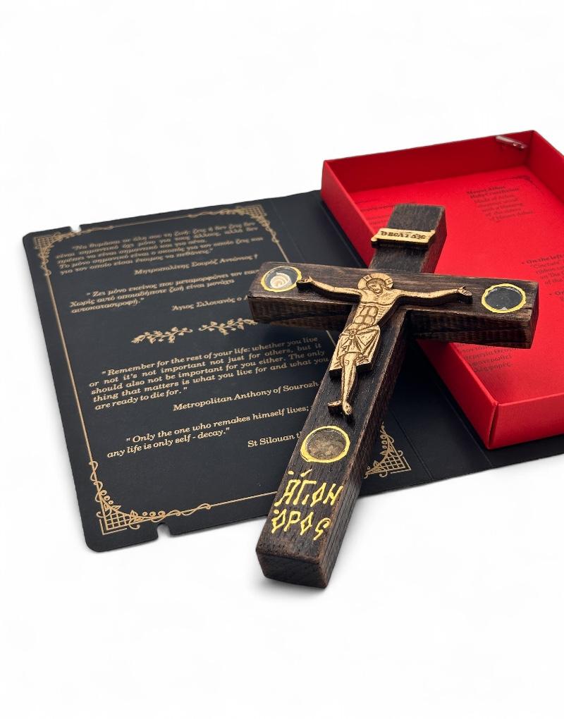 Bring home the authentic tradition of Mount Athos with a cross carefully crafted from Athonite chestnut wood and blessed by the fathers of this sacred place. You will discover upon it unique holy elements that carry spiritual power: